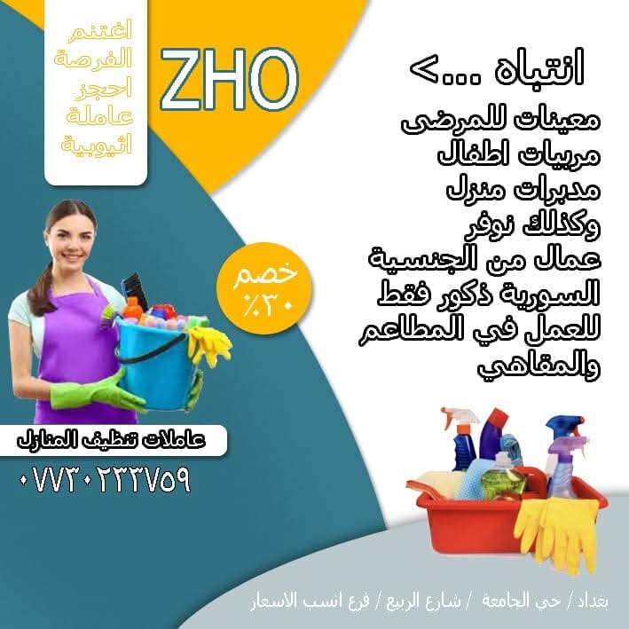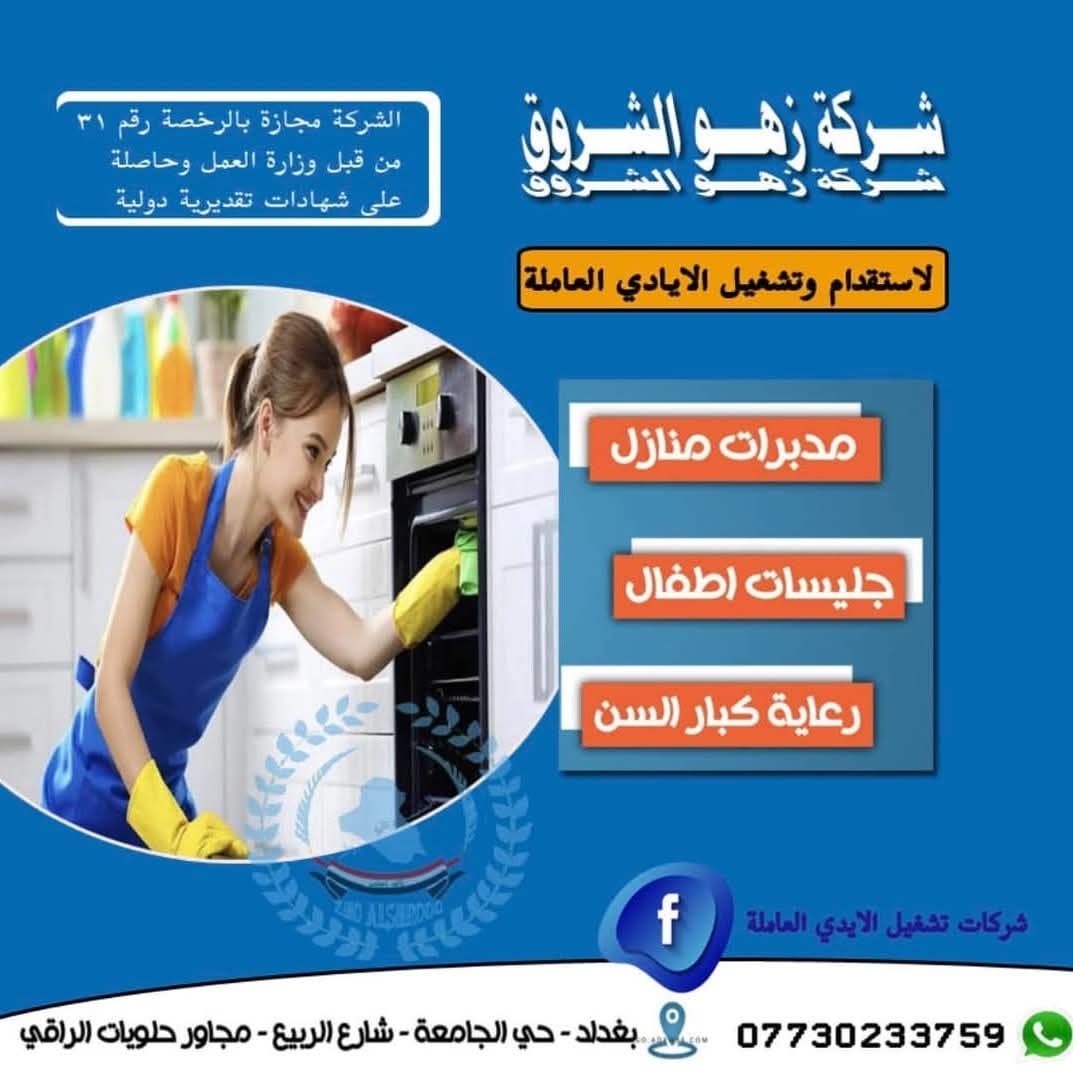 لتشغيل الايادي العاملة من دول إثيوبيا _ نيجيريا _ كينيا _ أوغندا _تنزانيا _ مربيات منازل و رعاية الأطفال و كبار السن _ الشركة مجازة من وزارة العمل العراقية _ خدماتنا منذ اكثر من 17 سنة
