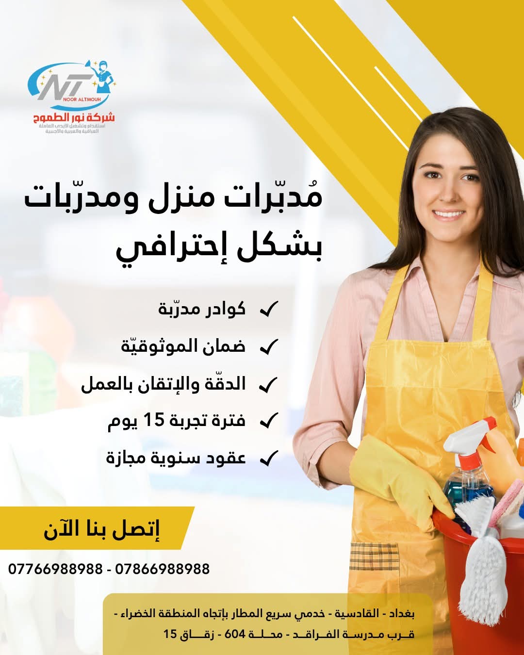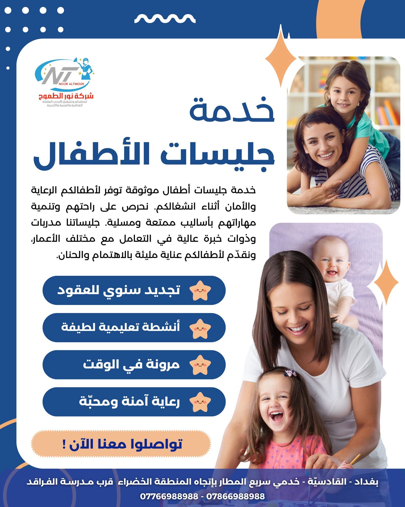 الشركة الرائدة في استقدام الأيدي العاملة العراقية و العربية و الأجنبية _ مربيات منازل _ رعاية كبار السن من المرضى و الأطفال _ تلبي احتياجات الأسرة العراقية